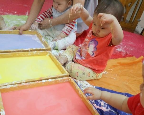 - Thường xuyên cho da, chân và tay bé được tiếp xúc với các loại đồ vật có tính chất khác nhau như trơn nhẵn, mềm, ấm, lạnh, thô ráp... kích thích khả năng xúc giác.