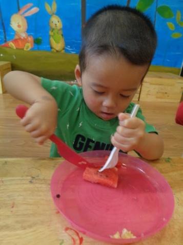 - Từ 18 tháng trở lên có thể cho trẻ tự cầm thìa xúc ăn, tập bóc chuối, dùng dao nhựa để cắt chuối; Cho trẻ xâu hột hạt; Cầm bút vẽ ngoệch ngoạc; Tập cầm đũa gắp hột hạt, ăn cơm; Cho trẻ rót nước từ cốc này sang cốc khác, từ chai này sang chai khác; Chơi với gạo, đỗ, ngô: xúc, đổ, đong,…