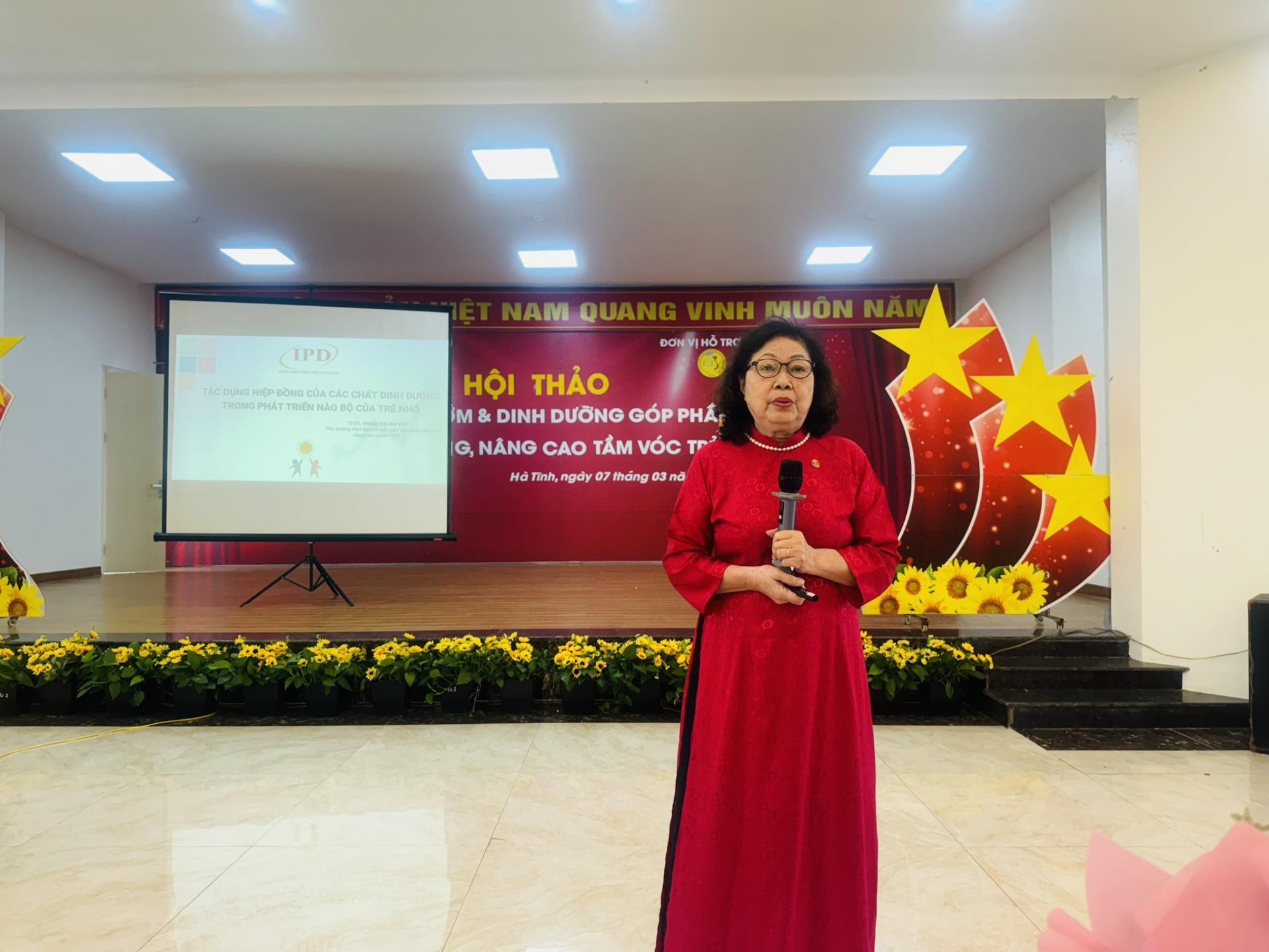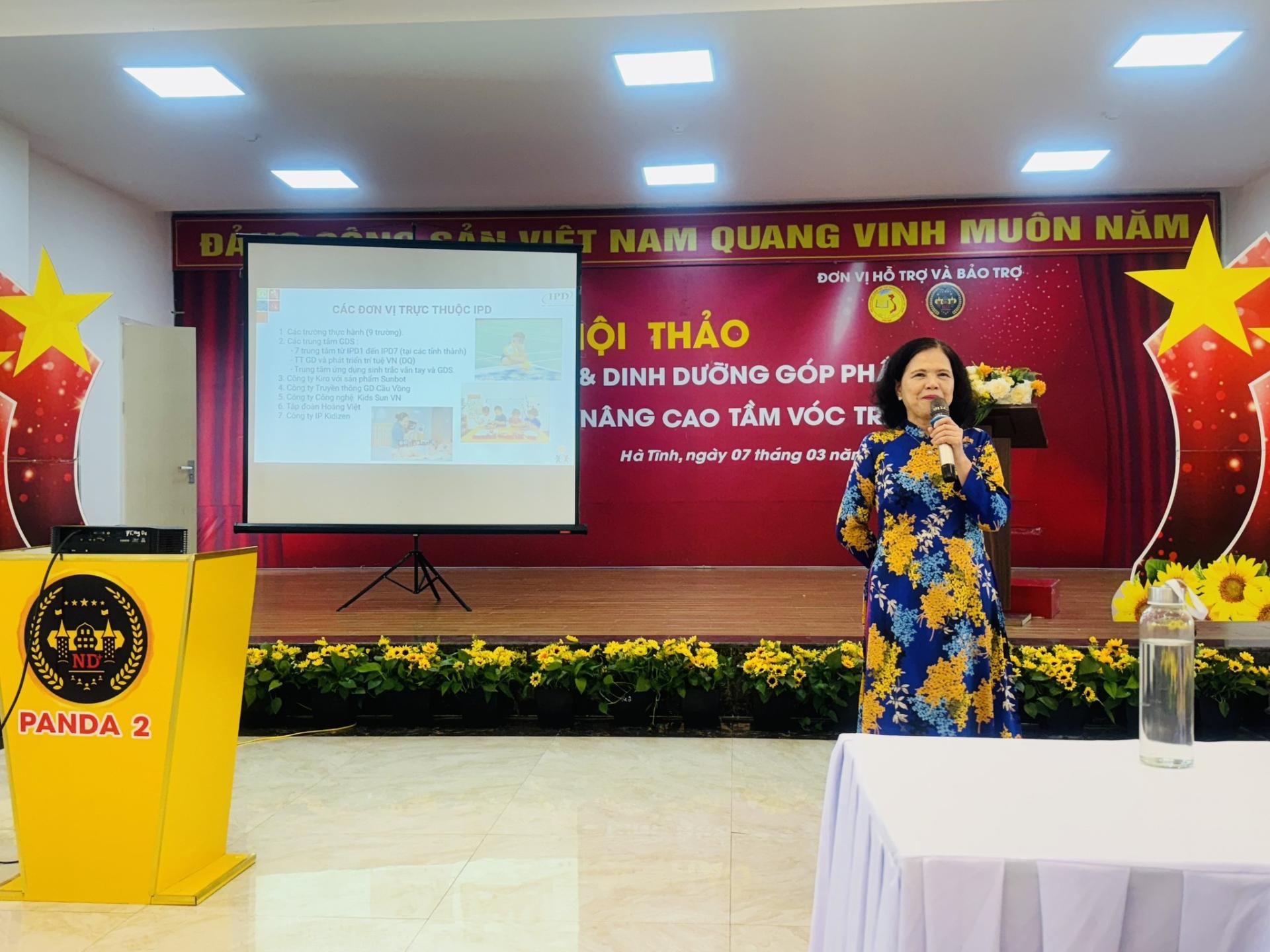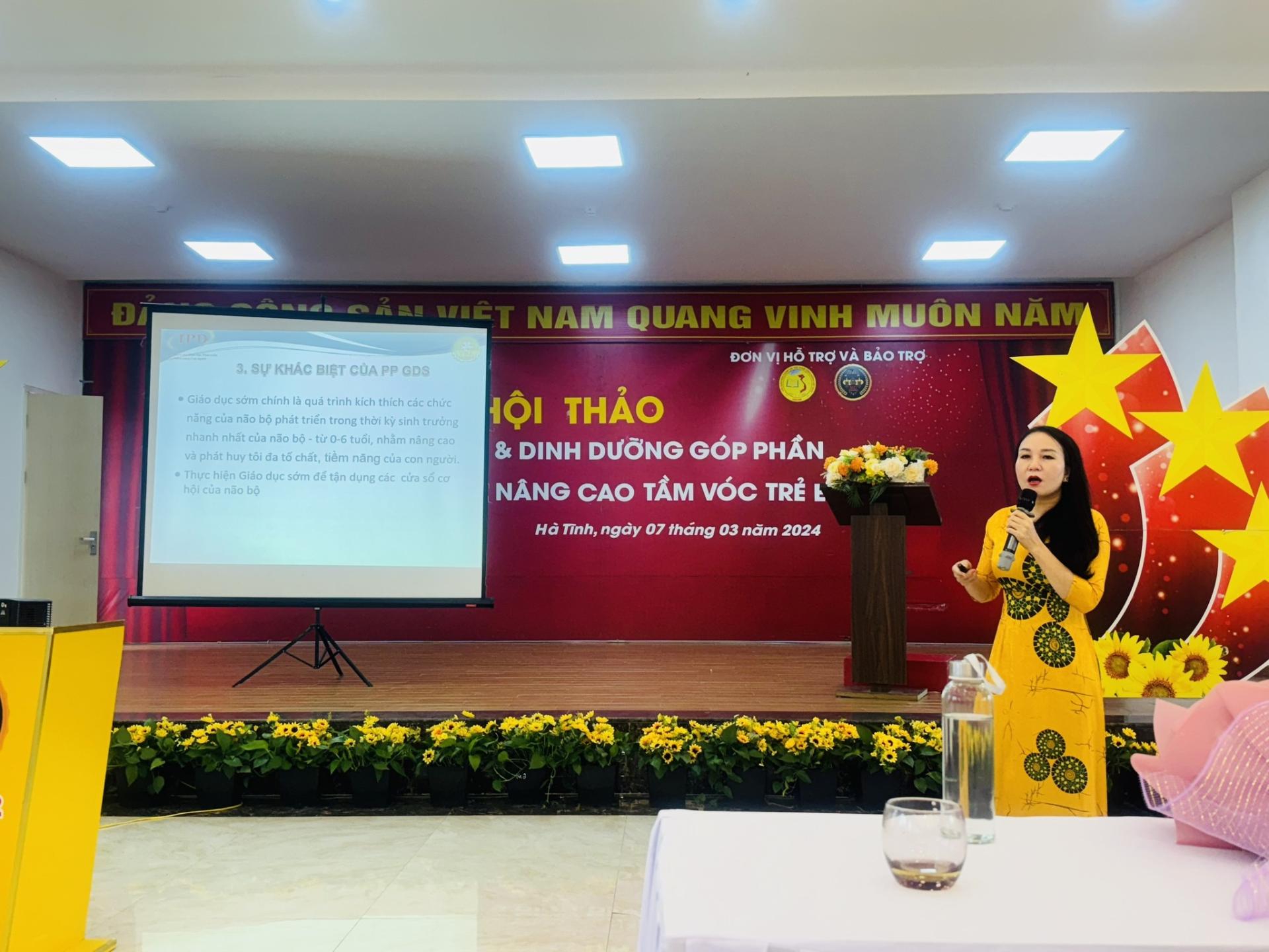 Hội thảo chào đón hơn 450 đại biểu đến từ Hội LHPN các trường Mầm non huyện, thị, thành phố trong tỉnh Hà Tĩnh đã được nghe các chuyên gia dinh dưỡng giới thiệu về phương pháp giáo dục sớm và hưởng ứng rất nhiệt thành khi Viện trưởng cùng các chuyên gia Giáo dục và Dinh dưỡng của Viện IPD báo cáo thực tiễn Giáo dục sớm tại Việt nam, chia sẻ tầm quan trọng của dinh dưỡng cho lứa tuổi học đường, lợi ích và các giải pháp áp dụng Giáo dục sớm trong các trường mầm non. Đây là quá trình kích thích các chức năng của não bộ phát triển trong thời kỳ sinh trưởng nhanh nhất của con người từ 0-6 tuổi. Thực hiện giáo dục sớm để tận dụng các cơ hội của não bộ, là xu thế giáo dục của thời đại. Phương pháp giáo dục này sẽ chú trọng thực hành, trải nghiệm; giáo dục bằng tình cảm, khích lệ, nêu gương và đánh giá. Giáo dục sớm sử dụng các phương pháp não phải như: tráo thẻ, rèn luyện khả năng tư duy logic, trí nhớ và trải nghiệm.