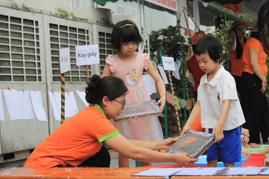 “Con rất yêu Trái đất, con muốn bảo vệ Trái đất luôn xanh. Cô dạy con làm giấy tái chế thì không cần phải chặt nhiều cây nữa ạ” – bé Trần Minh (4 tuổi) học sinh Trường mầm non VSK Thăng Long.